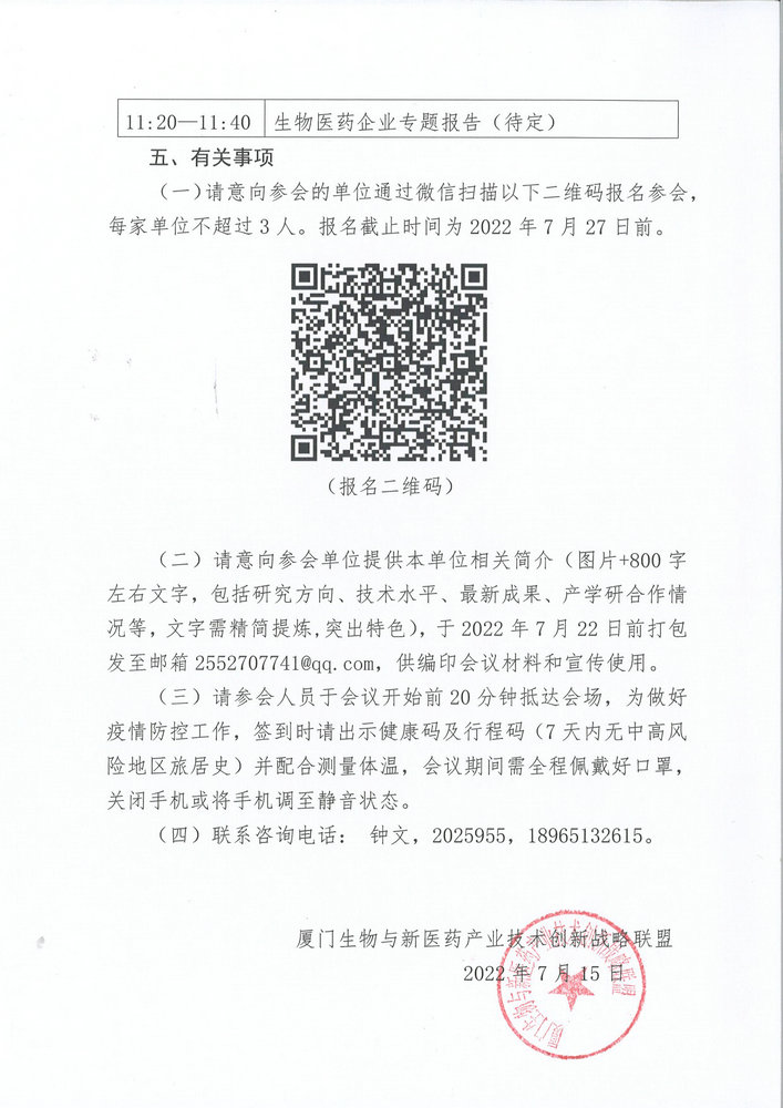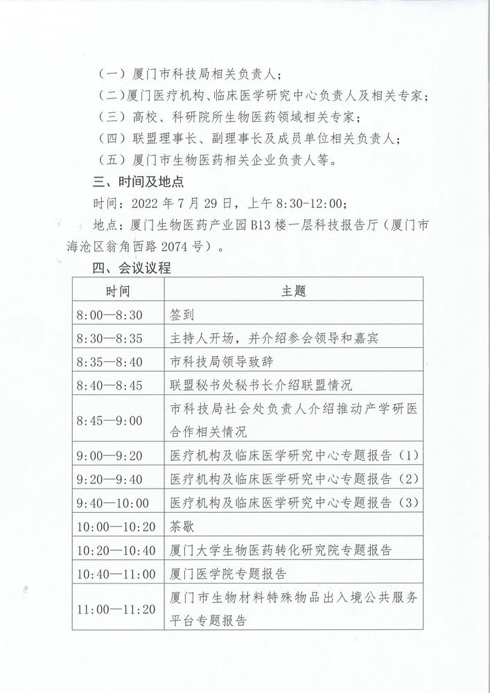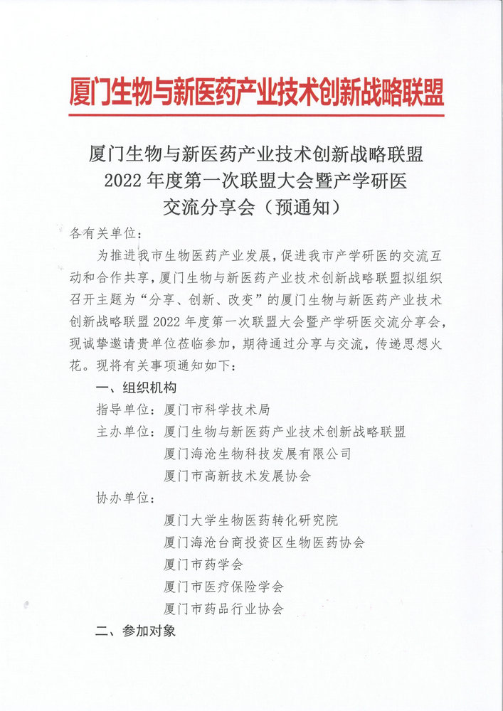 厦门生物与新医药产业技术创新战略联盟2022年度第一次联盟大会暨产学研医交流分享会(预通知)